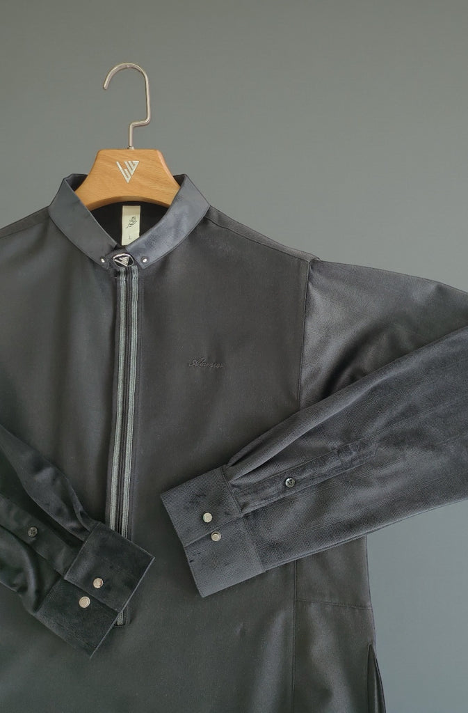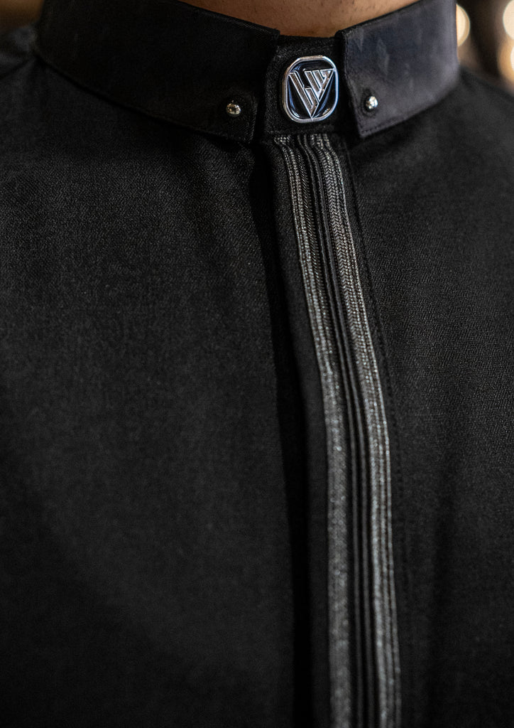 Made from a premium textured fabric in a deep black tone, this thobe delivers a smooth, structured drape while remaining lightweight and breathable. The snug stand collar is finished with subtle texture detailing and polished metal accents, offering a sharp, tailored look.